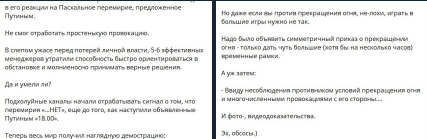Не смог отработать простенькую провокацию… Надо было объявить симметричный приказ о прекращении огня - только дать чуть большие (хотя бы на несколько часов) временные рамки. А уж затем: ввиду несоблюдения противником условий прекращения огня и многочисленными провокациями с его стороны… И фото-, видеодоказательства», – написал он.