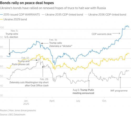 Большинство бумаг прибавили около 1 цента на доллар, а часть достигла максимума с момента реструктуризации госдолга на $20 млрд в прошлом году. Инвесторы увидели позитивные сигналы в переговорах о возможном завершении войны, сообщает «Reuters».