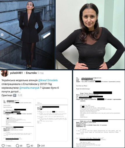 В сети публикуют сообщение женщины, которая называет себя бывшей моделью и утверждает, что Манюк (второе фото) отправляла девушек к Эпштейну для оказания секс-услуг. В качестве доказательства она опубликовала собственное фото, которое, по ее словам, содержится в файлах Эпштейна, а также скриншоты переписки. Она заявляет, что именно Манюк занималась отбором и направлением моделей из Украины.