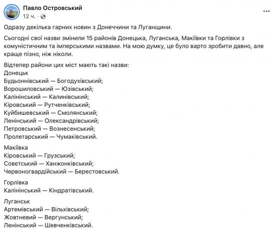 В Донецке Буденновский район переименовали в Богодуховский, Ворошиловский - в Юзовский, Калининский - в Калиновский, Кировский - в Рутченковский, Куйбышевский - в Смолянский, Ленинский - в Александровский, Петровский - в Вознесенский, Пролетарский - в Чумаковский.