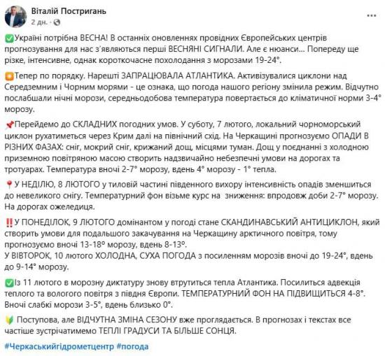 Об этом пишет руководитель Черкасского гидрометеоцентра Виталий Постригань.