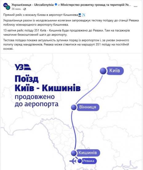 "Укрзализныця" запускает новый маршрут из Киева в аэропорт Кишинева