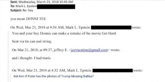 Согласно скриншоту, Марк Эпштейн однажды отправил своему брату Джеффри электронное письмо, в котором предложил спросить бывшего главного стратега Белого дома Стивена Бэннона, «есть ли у Путина фотографии, на которых Трамп сосет Буббе (прозвище Клинтона, который также был близко знаком с Эпштейном - Ред.)».
