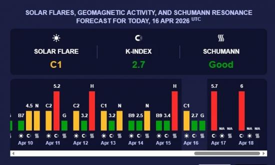 По данным специалистов, в пятницу, 17 апреля, прогнозируется солнечный шторм с мощностью 5,7 балла, а 18 апреля его интенсивность достигнет 6 баллов.