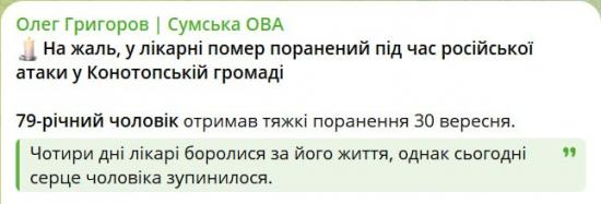 В больнице умер мужчина, которого ранило пулей ПВО во время отражения атаки дронов на Конотоп