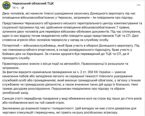 В Черкассах избили сотрудника ТЦК, заявили в областном военкомате