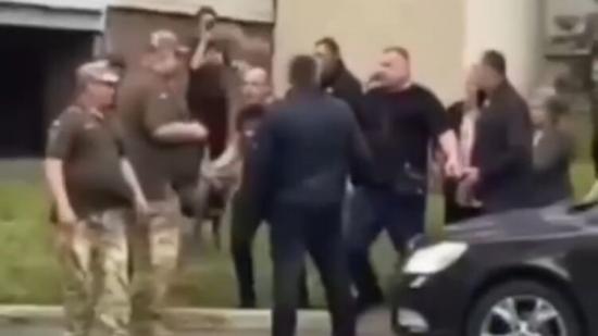 В ходе конфликта один из людей в камуфляже получил пинок ногой в бедро и пощёчину.