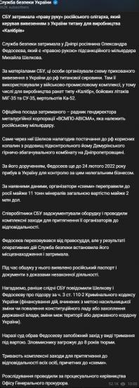 В Днепре задержан россиянин Александр Федосеев, который являлся "правой рукой" подсанкционного миллиардера Михаила Шелкова. Эти лица организовали схему скрытого вывоза титанового сырья из Украины в Российскую Федерацию, где оно использовалось в военно-промышленном комплексе, включая производство ракет типа "Калибр", боевых самолетов МиГ-35 и СУ-35, а также вертолетов Ка-52.