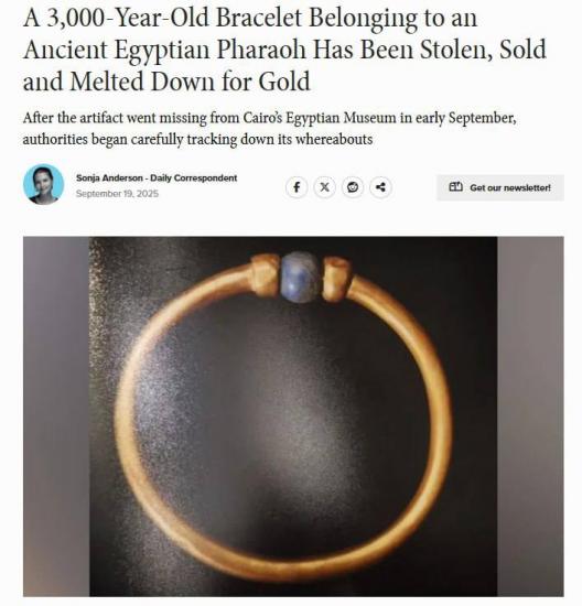 В Египте из музея украли уникальный золотой браслет фараона Аменемопета, возрастом 3000 лет
