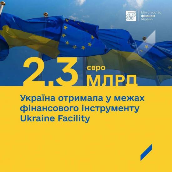 В госбюджет Украины поступило 2,3 млрд. евро от ЕС в рамках финансового инструмента «Ukraine Facility»