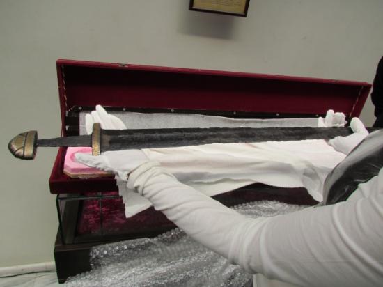 Меч был найден три года назад в Запорожье, возле острова Хортица. Его выловил из Днепра местный рыбак. Именно такой клинок изображен на украинской банкноте номиналом в 1 гривню. Оружие хорошо сохранилось, имеет длину 96 см и весит около килограмма.