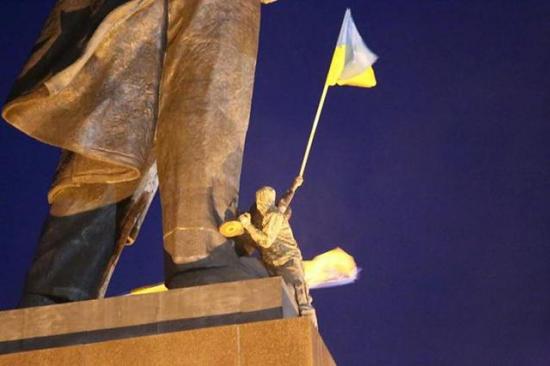 Как сообщает «Сегодня», несколько молодых людей оттирают надписи "Слава Украине" на постаменте.