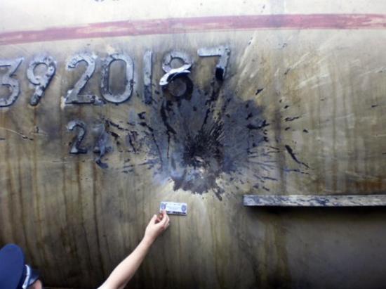 Во время выезда на перегон машинист поезда услышал звуки, напоминающие хлопок, но не стал останавливать поезд. По прибытию на станцию "Знаки" работники железной дороги осмотрели состав и выявили на одной из цистерн вмятину размером около 1 метра, о чем сообщили МВД. "В ходе осмотра места происшествия сотрудниками милиции установлено, что около 6 часов утра на указанном перегоне с лесного массива, который вплотную приближен к железной дороге, из оружия, которое сейчас устанавливается, был произведен выстрел по железнодорожной цистерне, которая двигалась в составе грузового поезда", - говорится в сообщении.