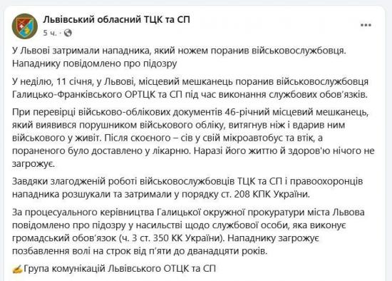 По информации ТЦК, мужчина оказался нарушителем воинского учёта и в ходе проверки документов ранил военкома ножом.