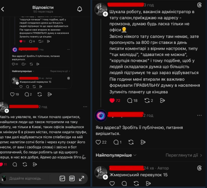 Одна из пользовательниц рассказала, что пришла на собеседование на позицию администратора тату-салона, но по факту оказалось, что это «офис», где предлагают публиковать комментарии за оплату примерно 800 грн в день.