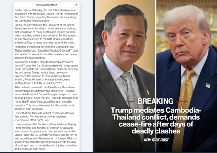 "После разговора с исполняющим обязанности премьер-министра Таиланда Его превосходительством Пхумтамом Вечачаем, уважаемый президент Дональд Трамп сообщил мне позитивную новость о том, что тайская сторона также согласилась на предложение достопочтенного президента о немедленном прекращении огня.