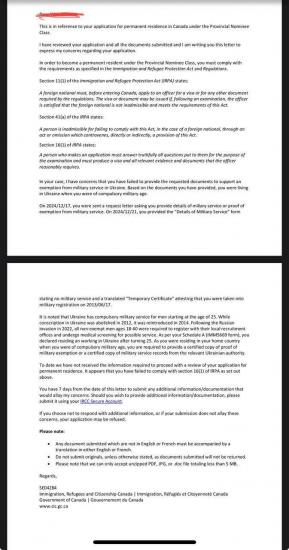 Также в паблике добавили письмо, полученное их читателем. Данное письмо офицер направил после того, как заявитель предварительно ответил на дополнительный запрос относительно информации о военной службе или ее отсутствии (military records form), добавил приписное свидетельство и объяснение, что никогда не служил и не призывался на службу. Но это не устроило канадского иммиграционного офицера.