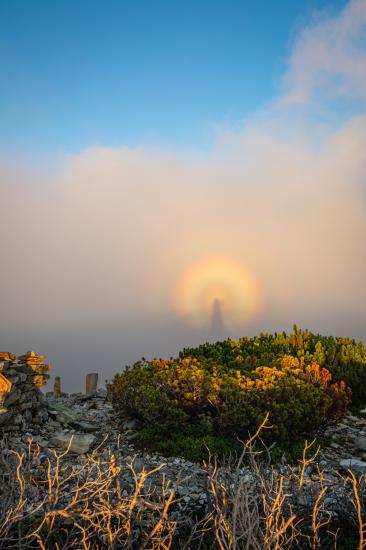 Оно возникает, когда солнце светит сзади наблюдателя, а тень проектируется на тучи или туман, создавая эффект гигантской тени с радужным ореолом.