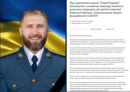 «Во время массированного ракетного обстрела Киева подполковник Сакун находился на боевом дежурстве в составе боевого расчёта. Подразделением было уничтожено несколько баллистических ракет, одна из которых должна была поразить позиции ЗРК. В результате падения обломков возник пожар. Несмотря на смертельную угрозу, офицер лично бросился спасать технику и тушить огонь. Из-за детонации боевой части сбитой ракеты Денис Сакун погиб», - говорится в петиции.