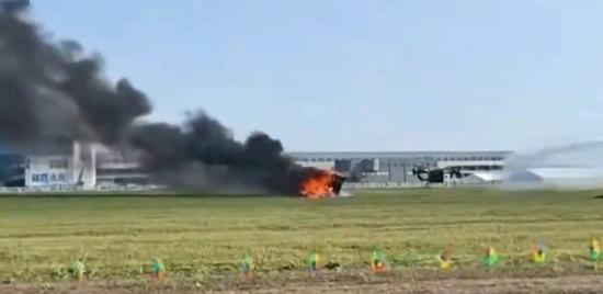 Из летательного аппарата «eVTOL» поднялся густой чёрный дым, а на место падения сразу приехали пожарные машины.