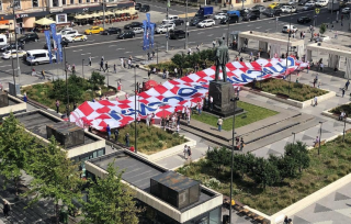 Футбольные болельщики сборной Хорватии развернули на Триумфальной площади в Москве огромный баннер с надписью «Спасибо, Россия!» на русском языке.