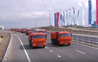 Президент РФ Владимир Путин в рамках церемонии открытия движения по Крымскому мосту на «КамАЗе» отправился в первую поездку по новому сооружению, соединяющему материковую часть России с полуостровом Крым.