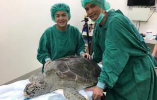 Тайские хирурги прооперировали и вытащили монеты и два рыболовных крючка из желудка черепахи, которая живет в одном из резервуаров в зоопарке.