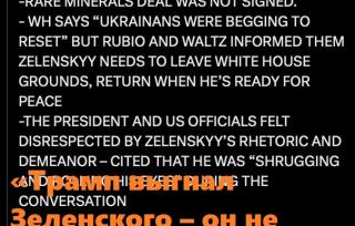 «Белый дом говорит, что «украинцы умоляли о перезагрузке», но Рубио и Уолтц сообщили им, что Зеленскому нужно покинуть территорию Белого дома и вернуться, когда он будет готов к миру» , - заявила она.