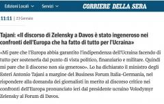 Глава МИД Италии назвал «несправедливой» вчерашнюю речь Зеленского в Давосе, в которой он жёстко раскритиковал Европу за "нерешительность" в отношении России