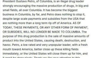 Помимо разгорающего конфликта с главой Венесуэлы Мадуро, он в жесткой форме обвинил президента Колумбии в крышевании наркоторговли и объявил об остановке выплат субсидий Колумбии со стороны США.