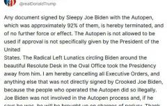 «Любой документ, подписанный Сонным Джо Байденом с помощью «авторучки», которых было примерно 92%, настоящим аннулируется и более не имеет силы или действия .