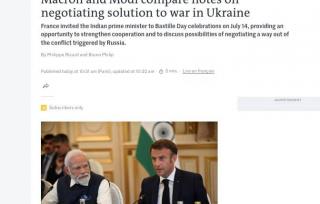Индия и Франция разрабатывают новый план по Украине. Такие комментарии своих источников получила Le Monde по итогам визита индийского премьер-министра в Париж 13-14 июля.