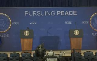 "В стремлении к миру": гласит надпись в конференц-зале, где после переговоров предполагается выступление Путина и Трампа