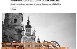 Статья с таким заголовком вышла в New York Times, в которой приводится сегодняшняя цитата Зеленского об отказе отдавать России территории как «решительный отказ от уступок» .