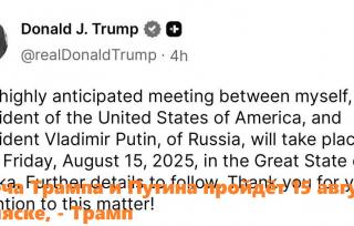 «Долгожданная встреча между мной, президентом США и президентом России Владимиром Путиным состоится в пятницу, 15 августа 2025 года, в великом штате Аляска. Дополнительная информация будет представлена позже», - написал Трамп.