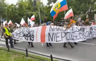 Около тысячи поляков с флагом РФ впереди колоны прошли маршем против ЛГБТ-пропаганды перед посольством США в Варшаве.
