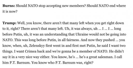 Критикуя Зеленского, он рассказал, что на первой встрече с Путиным президент Украины заявил: «Я хочу две вещи. Я хочу вернуть Крым, и мы будем членом НАТО». По словам Трампа, Зеленский озвучил это «не очень любезно».