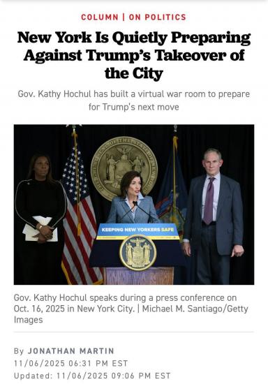 «Встревоженая тем, что Трамп может сделать в ответ на избрание Зохрана Мамдани мэром Нью-Йорка, губернатор Кэти Хохул организовала виртуальную военную комнату и провела переговоры с правоохранительными органами, деловыми чиновниками и группами активистов, чтобы остановить или, по крайней мере, смягчить любое федеральное вторжение», - пишет Politico.