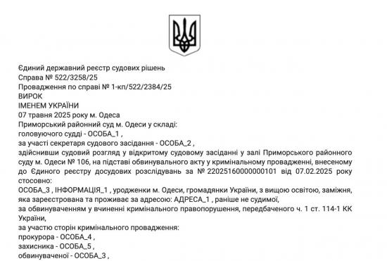Суд приговорил ее 5 годам тюрьмы с испытательным сроком 2 года за препятствование законной деятельности ВСУ в особый период.