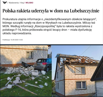 При этом этом премьер Польши Туск заявил, что даже дом в Польше был разрушен ракетой с польского F-16, то «вся ответственность за повреждение лежит на РФ».