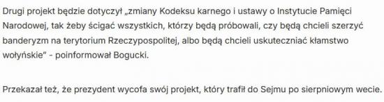 Проект будет касаться «внесения изменений в Уголовный кодекс и Закон об Институте национальной памяти, чтобы привлечь к ответственности всех тех, кто пытается или хочет распространять бандеровщину на территории Республики Польша или хочет увековечить ложь о Волынской резне», – сказал Богуцкий.