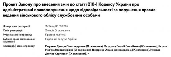 Законопроект 15115 внесла та же группа депутатов, что и законопроект об отмене ошибочных «розысков» и штрафов женщин по линии ТЦК, в частности, Разумков, Безуглая и Мазурашу.