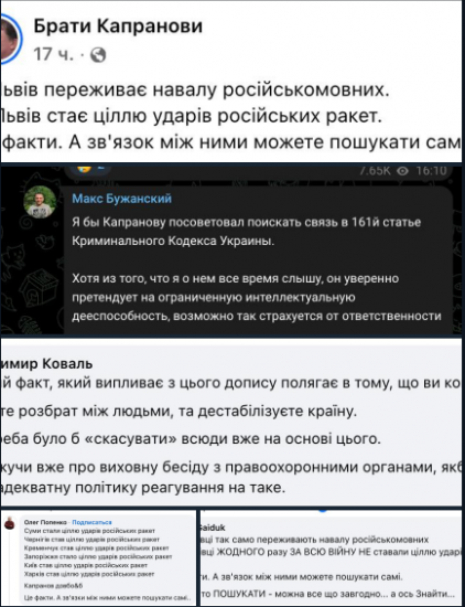 «Львов переживает нашествие русскоязычных. Львов становится целью ударов российских ракет. Это факты. А связь между ними можете поискать сами», - написал он в Facebook.