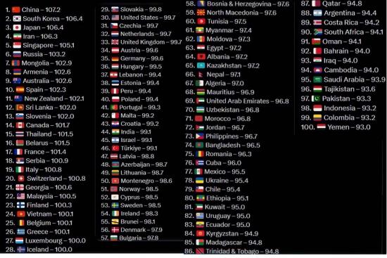Лидерство удерживает Китай со средним показателем 107,2. В число стран с самыми высокими значениями вошли Южная Корея и Япония (по 106,4), а также Иран – 106,3.
