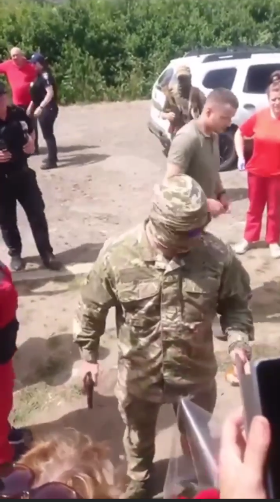 В сети публикует видео, где человек в военной форме угрожает мужчине пистолетом, заставляя его выйти на улицу из салона автобуса