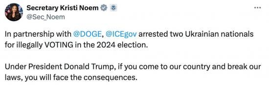 "При президенте Дональде Трампе, если вы приедете в нашу страну и нарушите наши законы, вы столкнетесь с последствиями", - написала она в Х, добавив, что аресты произвели в сотрудничестве с DOGE Илона Маска.