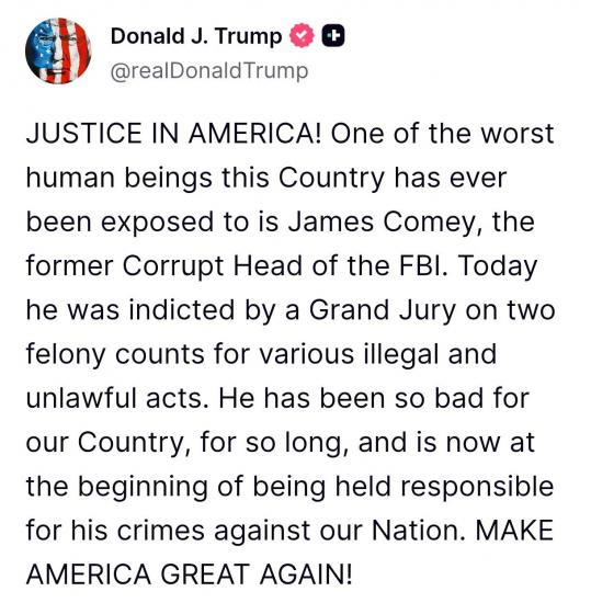 Комментируя обвинения, Трамп написал: "Один из худших людей, с которыми когда-либо сталкивалась эта страна, — это Джеймс Коми. Он так долго причинял вред нашей стране, и теперь наконец-то пришло время, когда он будет привлечен к ответственности".