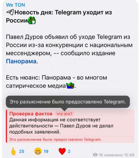 Поводом стала ложная новость от канала We TON о якобы уходе Telegram из России, со ссылкой на сатирическое издание «Панорама».