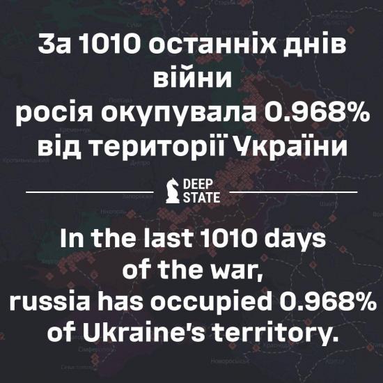 Военный паблик Deep State сегодня заявил, что с 12 ноября 2022 года (то есть после завершения наступления ВСУ в Херсонской области) Россия захватила менее процента территории Украины.