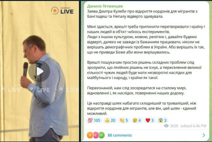 Бывший глава МИД Украины Дмитрий Кулеба заявил, что демографическую проблему в Украине можно решить путем открытия границ для мигрантов.